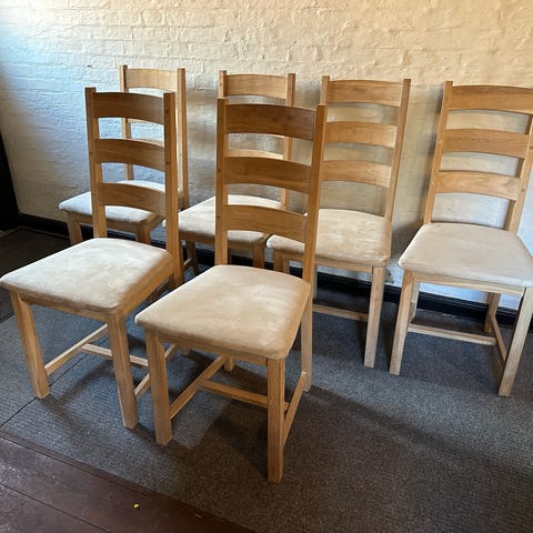6 stk. Spisebordstole i egetræ med brune stofsæder. Sælges samlet