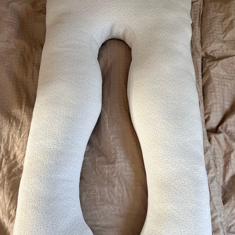 Ammepude i brun farve. Puden er formet som et langt, buet rør, der kan placeres rundt om kroppen for støtte. Kan anvendes som støtte ved amning eller flaskegivning samt som komfortpude til afslapning eller søvn. Betrækket fremstår i et let, struktureret stof.