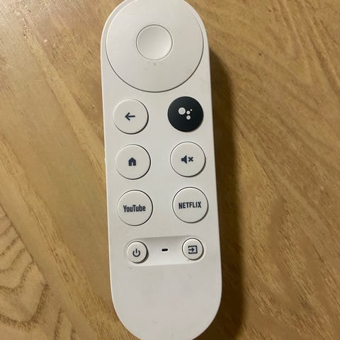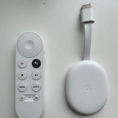 Google Chromecast med Google TV med fjernbetjening i hvid. Næsten ikke brugt.