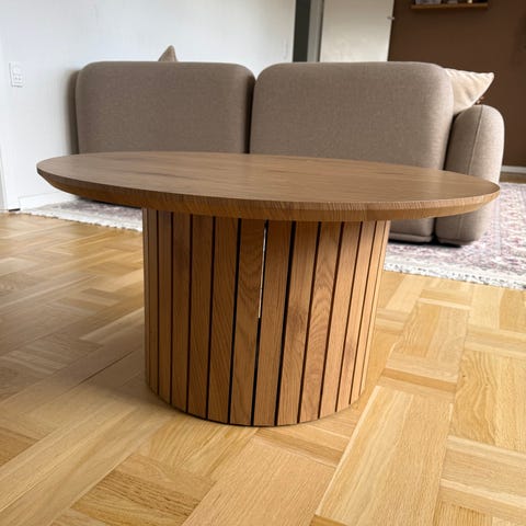 Sofabord med lameller Årsag til Outlet: Brudt emballage / Mindre fejl på bordkant (se billeder) Den runde bordplade i egefiner giver et blødt og indbydende udtryk, mens den karakteristiske lamelfod giver et moderne præg. Uanset om du er til det lyse og naturlige eller det dybe og varme, fås bordet i både naturlig eg og røget egefiner, så du kan vælge det, der passer bedst ind hjemme hos dig. Perfekt til kaffekoppen, hyggestunden eller bare som et stilrent midtpunkt i stuen.Vedligeholdelse: Alle Lewis-borde er olieret og derefter lakeret, hvilket gør dem vedligeholdelsesfrie.