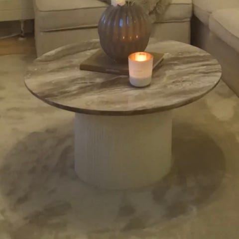 Smukt og moderne rundt sofabord med elegant marmorlook bordplade i glas og guldfarvet stel. Passer perfekt til en moderne indretning og giver et eksklusivt udtryk i stuen.