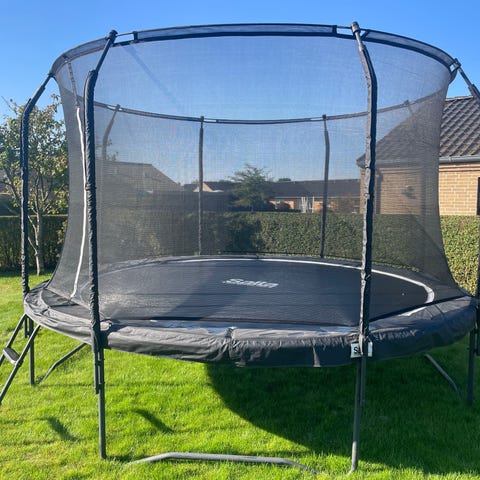 North Trampoline Explorer nedgravningstrampolin, rund model i sort. Trampolinen er beregnet til nedgravning i haven og leveres med rammedele, fjedre, kantpude og springdug som vist på billederne. Der medfølger tilbehør som monteringskroge og opbevaringsposer samt manualer/vejledninger fra North Trampoline. Velegnet til udendørs brug i private haver, hvor en nedgravet løsning ønskes for et mere diskret udtryk og nem adgang til trampolinen.