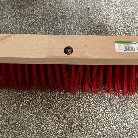 Kost til udendørs brug med langt træskaft og røde, stive børster i plast. Velegnet til fejning af terrasse, indkørsel eller andre hårde underlag. Børstehoved i rektangulær form, monteret på træholder med gevind til skaftet.