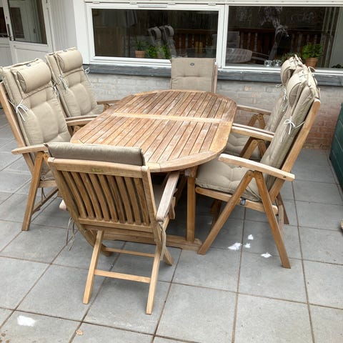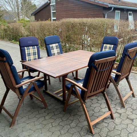 Flotteste havemøbelsæt med 6 stole fra Daneline. Inkl kvalitetshavehynder. Pæn stand, uden fejl og mangler.