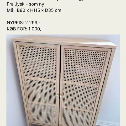 Flot kommode fra Jysk i lys træ med fine fletdetaljer på lågerne, der giver et moderne og naturligt udtryk.