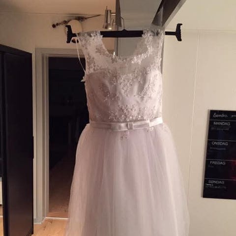 Lucca kjole til piger i hvid farve. Kjolen er knælang med asymmetrisk én-skulder strop og draperet overdel. Der er dekorative perle- og stenbesætninger langs stroppen og skråt ned over overdelen. Stoffet fremstår let og lagdelt, egnet til brug som Konfirmationskjole