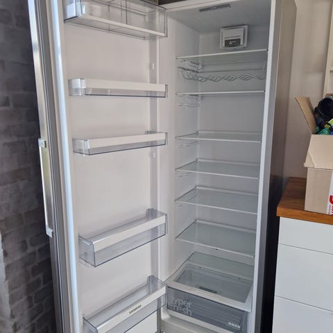Siemens køleskab i hvid med flere glashylder og dørhylder til opbevaring af mad og drikke. Indvendigt er der justerbare hylder, grøntsagsskuffer i bunden samt plastikhylder i døren til fx flasker og mindre varer.