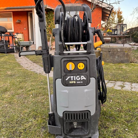 Ryobi højtryksrenser 1800W. Elektrisk højtryksrenser egnet til rengøring af fx terrasser, indkørsler, facader og køretøjer. Sættet på kassen viser sprøjtepistol, lanse og dyser. Medfølgende haveslange ses på billedet, som kan bruges til vandtilførsel til højtryksrenseren.