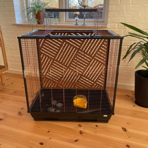 Fuglebur i reolsystem med plads til 2 eller 4 par. Buret er fremstillet i træ med front i metalgitter. Med skuffer. Der medfølger forskellige plastskåle og tilbehør til foder og vand. Målene på trærammen fremgår af billederne og viser cirka længde. Velegnet til mindre fugle. Der er et hul bag buret til evt udendørs voliere.