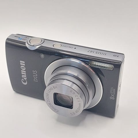 Canon Ixus 140 digitalkamera i grå. Kompaktkamera med indbygget zoomobjektiv og stor bagudvendt skærm til billedvisning og menuvalg.
