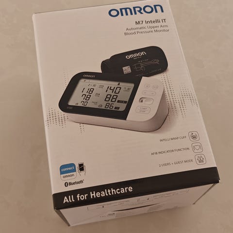 Omron blodtryksmåler til overarmen med tilhørende manchet. Har digitalt display med visning af systolisk og diastolisk blodtryk samt puls. Manchetten tilsluttes med slange til måleren og lægges omkring overarmen efter anvisningerne på manchetten. Velegnet til hjemmebrug til kontrol af blodtryk. Købt for 430 kr.