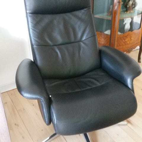 Img space 3800 lænestol i sort læder. Den har fin patina og man sidder virkelig godt. Ryg og nakkestøtte kan justeres.