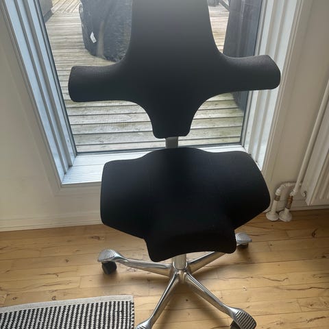 Ergonomisk Håg Capisco stol i sort i god stand. Den har en særlig kombination af krom ben og bagstykke i aluminium.