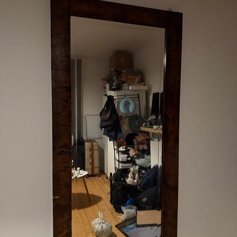 IKEA spejl med træramme. Rektangulært spejl med kraftig ramme i træ med mørk finish. Spejlet kan anvendes som vægspejl eller stående spejl i soveværelse, entré eller stue. Designet har en dyb ramme med lameller på siderne, som giver et markant udtryk og indrammer spejloverfladen.