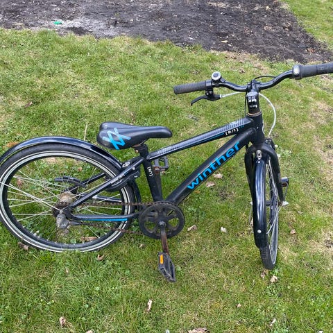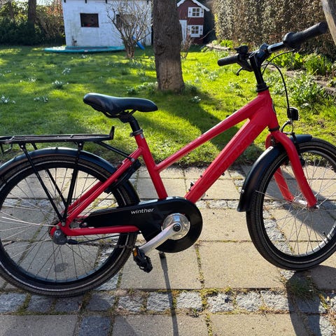 Winther 100 børnecykel med 20" hjul. Cyklen har lav indstigning og er udstyret med forkurv, bagagebærer, skærme og kædeskærm. Farven er rød og sølv. Velegnet som hverdagscykel til børn i den størrelse, der passer til 20" hjul.