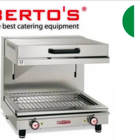 Oven er udført i rustfrit stål med flere hylder/ribber indvendigt, som giver mulighed for at placere bageplader eller riste i forskellige højder. På siden sidder flere drejeknapper til regulering af varmezoner eller funktioner. Enheden er beregnet til professionel brug i f.eks. restaurant, café eller storkøkken.
