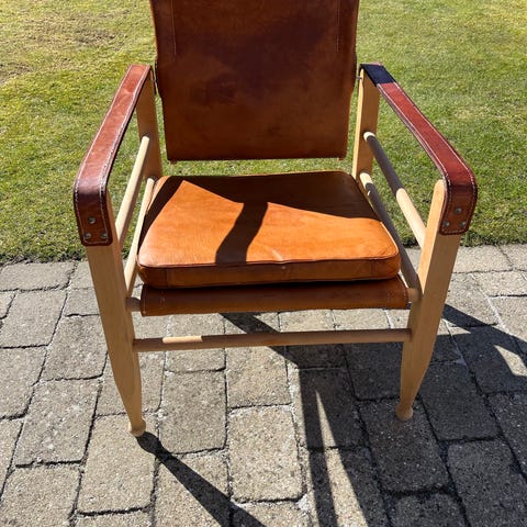 Flot Aage Bruun og Søn safaristol i cognac farvet kernelæder med unik patina og original pude. Flotte syninger. Egetræ.