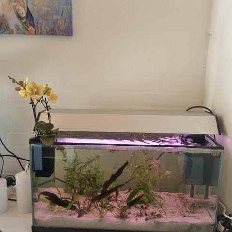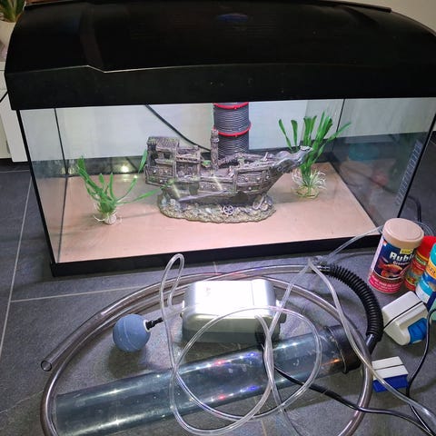 Sælger akvarie 57 L, da jeg ikke behøver det mere. Det fungerer, som det skal. Der er alger og skal derfor rengøres. Pumpe, varmelegeme, bundlag og to voksne sugemaller (hun og han) og to unger medfølger.