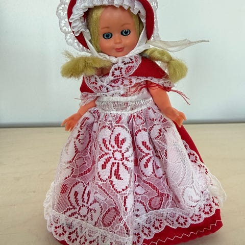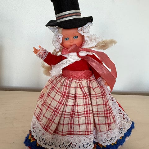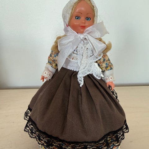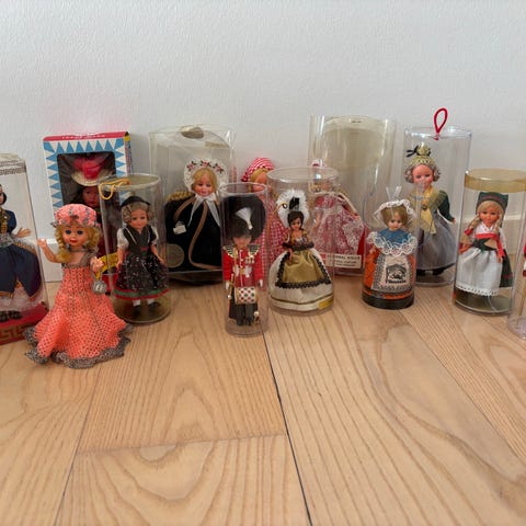 Samling dukker i folkedragter. Dukkerne er klædt i forskellige traditionelle dragter med mange farver og detaljer. Egnet som samlerobjekter eller dekoration.