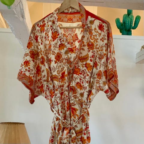 Så smuk en kjole/kimono i de smukkeste glade farver🌸🌈 den er gennem knappet og der er lommer og bindebånd om livet samt lidt slids i siderne.