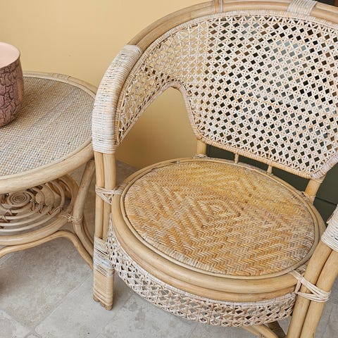 Stolene står på en stabil rattanramme med skrå ben og tværstivere. Egner sig til brug i stue, udestue eller overdækket terrasse, hvor der ønskes afslappet siddeplads med lav sædehøjde.