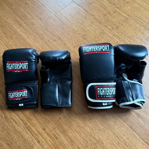 Fighters boksehandsker og bokseudstyr sæt i sort. Sættet omfatter et par boksehandsker, træningshandsker, hovedbeskytter samt sjippetov. Udstyret er egnet til boksning eller lignende kampsportstræning og giver grundlæggende beskyttelse af hænder og hoved under træning.