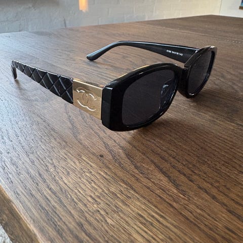 Chanel vintage solbriller til kvinder. Rektangulære glas med brun toning og let stel i metallook. CC Chanel-logo ved glassene. Chanel etui medfølger. Fremstår i fin stand og selve glasset er rigtig fint.