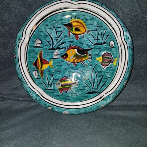 Lille fint græsk keramikfad. Hvidt med dekoration af blomster og dådyr i blå glasur. Producent er Nassos Rhodos. Måler 13 x 13 cm.