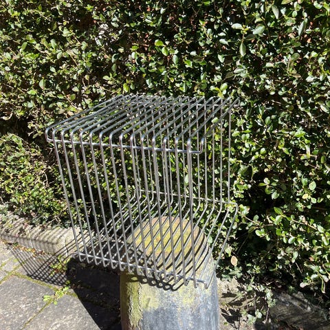 Montana Panton Wire reolmodul i blålakeret metal. Modul i kubeform med åbne sider, velegnet som lille reol, hylde eller sidebord. Kan bruges enkeltstående eller sammen med flere moduler til opbevaring eller udstilling af bøger og andre genstande.