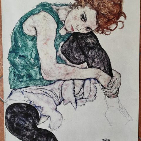 Egon Schiele plakat med motiv i lyse og mørke nuancer. Plakaten er monteret i en enkel, lys egetræsramme med ophæng. Den er 81 x 81 cm.