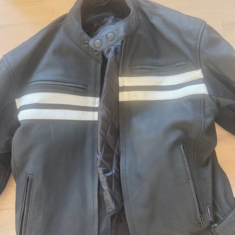 Outtrek lædder bukser har 2 str. - L og XL kr 250 pr stk - kr 400 samlet. Har også jakke hvor de kan lynes sammen - jakke stk L pris det hele samlet 2x bukser, 1 jakke kr 600