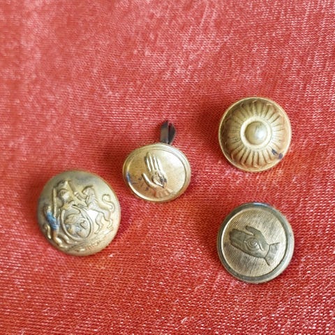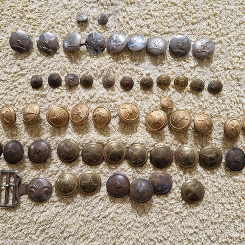 Gamle fine, ubrugte og brugte messingknapper og emblemer fra fængselsbetjent-uniform, Horsens Statsfængsel i 1940' erne.