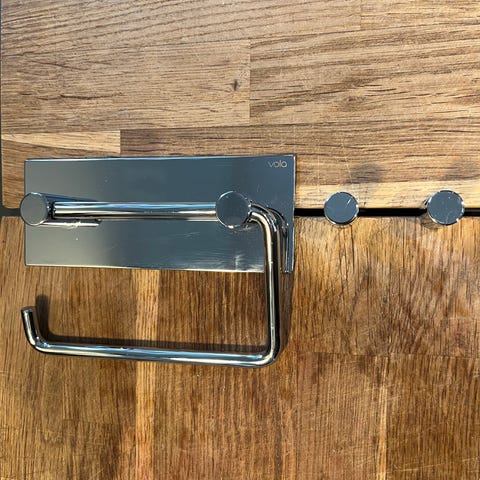 Vola toiletrulleholder i krom. Monteres på væg og er udført i et moderne, rektangulært design med rund arm til ophæng af toiletrulle. Velegnet til badeværelse eller gæstetoilet.