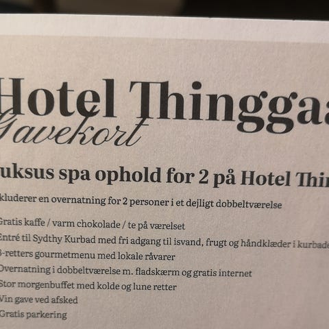 To overnatninger for 2 personer i dejligt standart dobbeltværelse. Lækker menu med 7 spændende anretninger på ankomstdagen (yderst sjældent serveres en mindst lige så lækker buffet). Stort morgenbord med kaffe/te og juice begge dage. Eftermiddagskaffe/te begge dage. Kage den ene dag. Fri adgang til wellnessområde med stor swimmingpool, dampbad, jacuzzi, sauna og fitness.