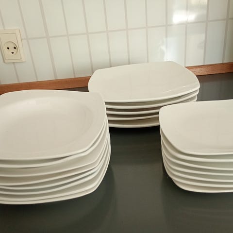 4stk.IKEA tallerkener i hvidt porcelæn/keramik. Tallerkenerne er kvadratiske med let afrundede hjørner. Velegnet som middagstallerkener eller serveringsfade i køkken og spisestue. Sælges sammen for kr.75