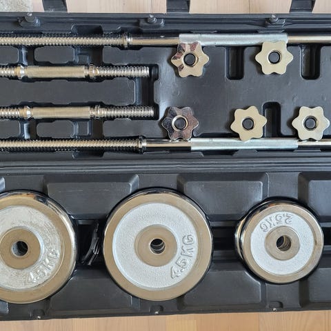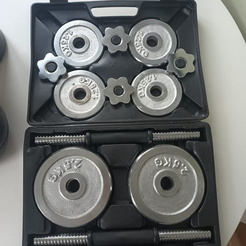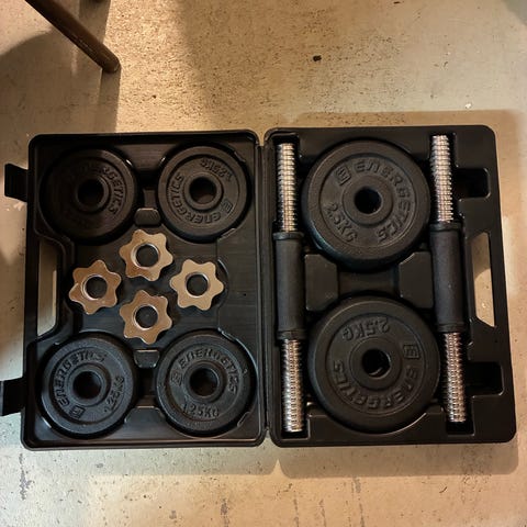 Hej. Jeg sælger dette træningset perfekt til din hjemme træningsrutine. Den medfølger: (i alt 19kg i vægte)