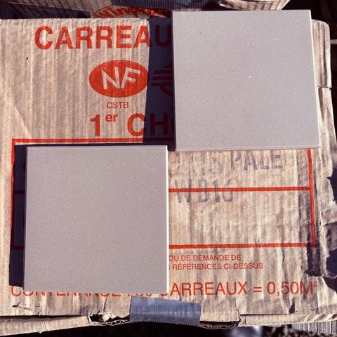 Sælger 3 kasser Winckelmans 5×5 cm uglaserede fliser i farven Light Grey. Perfekt til bad, brus, køkken, mosaikmønstre eller restaureringsarbejde.