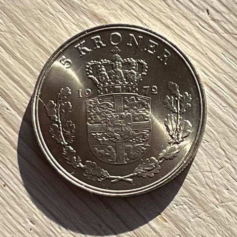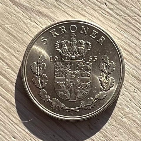 Danmark 5 kroner mønt fra 1969 med portræt af Frederik IX på forsiden og rigsvåben på bagsiden. Mønten er rund og fremstår i metal med pålydende værdi 5 kroner. Egnet til samlere af danske mønter og historiske betalingsmidler.
