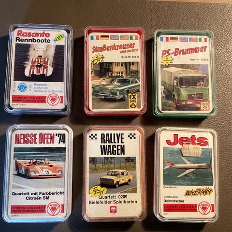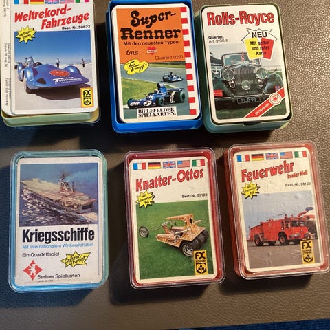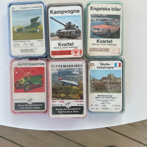 ASS Altenburger kvartetkort sæt med forskellige temaer relateret til køretøjer og fartøjer. Sættet omfatter blandt andet kortspil med motiver af kampvogne, skibe, helikoptere, Formel 1-biler, motorbåde/yachter og lokomotiver.