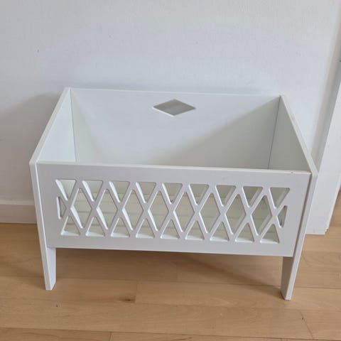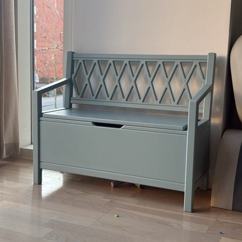 Cam Cam Copenhagen bænk med opbevaring til børn i blå. Den er i god stand, men har lidt skrammer, bl. a. indeni. Mål h: 69,5 cm, b: 58,5 cm, siddehøjde 31,5 cm.