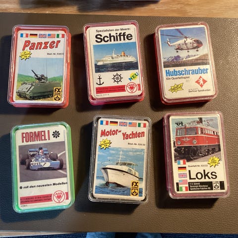 ASS Altenburger kvartetkort sæt med forskellige temaer. Sættet omfatter blandt andet kortspil med racerbiler, Rolls-Royce, brandbiler, krigsskibe og andre køretøjer.