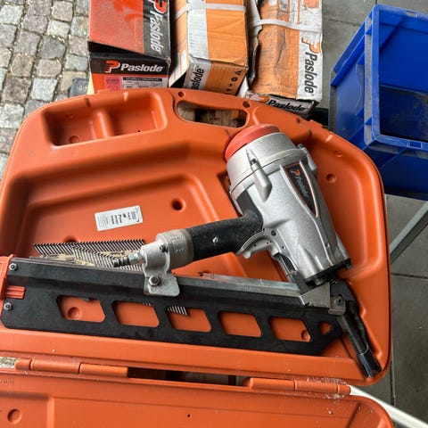 Paslode PPN50Ci sømpistol med kuffert. Gaspowered sømpistol til befæstelse af beslag og lignende opgaver i træ. Sættet omfatter sømpistol, plastkuffert, brugsanvisning og tilbehør som beskyttelsesbriller og oplader/batteri, jf. billederne. Velegnet til professionelt og privat brug, hvor der er behov for effektiv sømning uden kabeltilslutning.