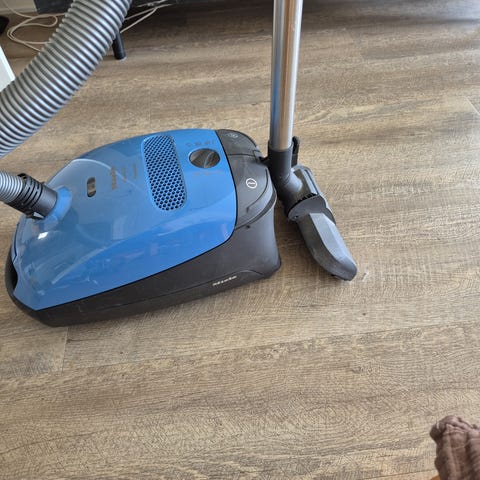 Miele støvsuger mundstykke i lille størrelse. Mundstykket er udført i grå plast og har en bred, flad form med to røde fnug-/tekstilbånd på undersiden. Til rengøring af mindre flader som møbler, tekstiler eller trapper.