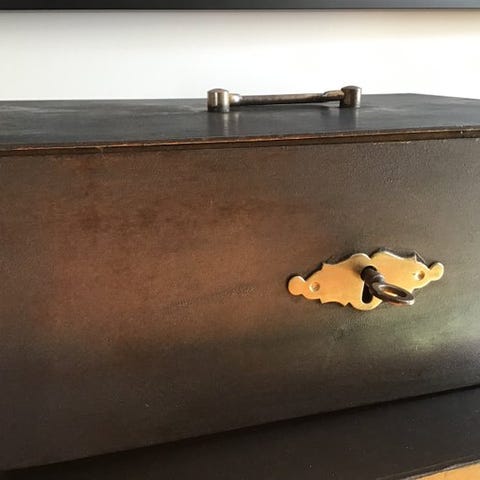 Kasse i metal med den skønneste patina, opbevaring eventuelt smykkeskrin m hylder