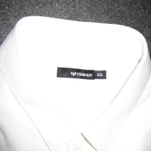 Hvid herre skjorte, flot, bomuld og polyester "Minimum" lidt faconsyet, monogram "M" på venstre side af brystet, hals str. 44-46 cm, ved oprullet ærmer er der strop og knap til at holde dem fast, ny, aldrig brugt