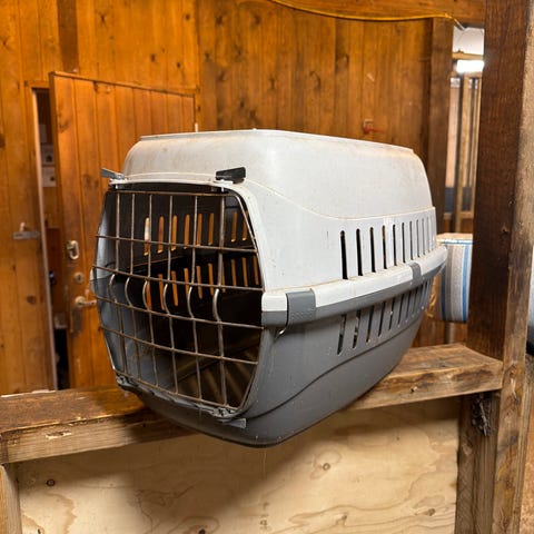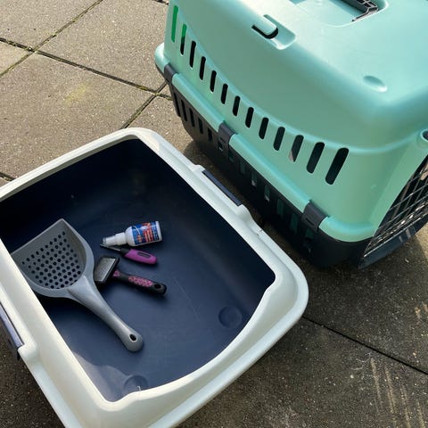 Transportkasse og kattebakke med låg i plast. Transportkassen har gitterlåge foran og bærehåndtag øverst, egnet til mindre kæledyr som kat eller lille hund. Kattebakken er med hætte og svinglåge foran, hvilket hjælper med at holde grus og lugt inde. Begge dele er i lysegrøn plast og kan bruges til transport og daglig brug i hjemmet til kæledyr. De to til 200
