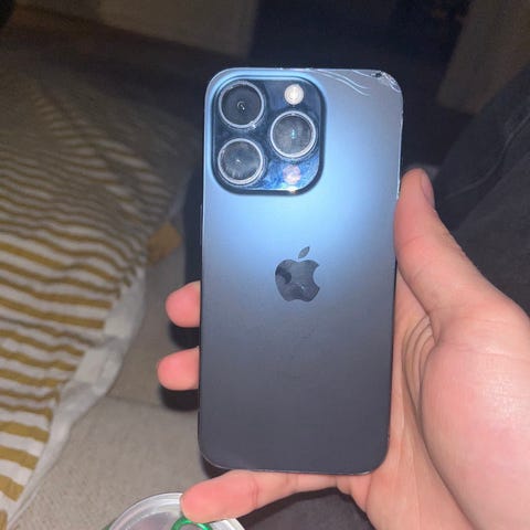 Apple iPhone 15 Pro smartphone med 128 GB intern hukommelse. Modellen har stor skærm med frontkamera i skærmens øverste del og tredobbelt kamera på bagsiden. Fungere upåklageligt med 88% batterikapacitet