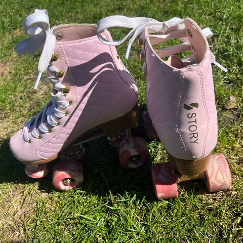 Story Phoenix rulleskøjter i størrelse 36. Klassiske side-by-side rulleskøjter med snørelukning og høj støvle, der giver støtte omkring anklen. Overdel i sort materiale med quiltet mønster. Undervogn med metalstel og fire hjul monteret parvist. Velegnet til børn med skostørrelse 36 til brug på jævne underlag som fx asfalt eller indendørs gulve.