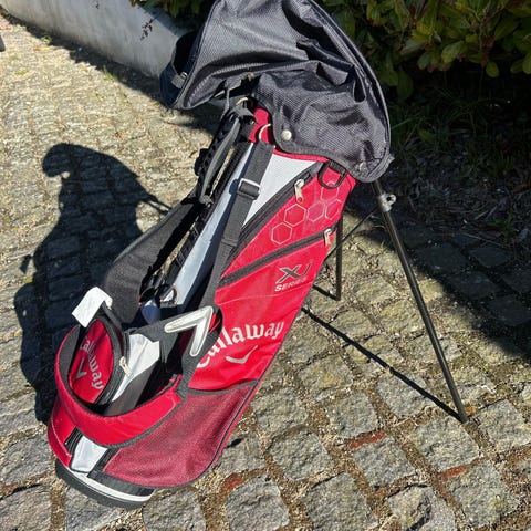 Callaway golfbag standbag i blå og sort. Tasken har bæreseler til ryggen og indbyggede ben, så den kan stå selv på banen. Flere lommer til opbevaring af bolde, handsker og tilbehør samt separat rum til køller. Velegnet til transport og brug på gående runder.