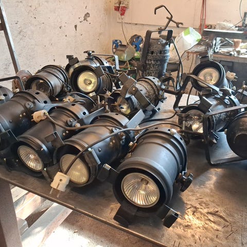 Scenelys parlamper i metal i sølvfarve. Lamperne er beregnet til brug som scenebelysning eller effektlys i for eksempel øvelokale, scene eller lignende. De er udført i metalhus med beslag til ophæng/montering. Egnede til brug med passende pærer/lyskilder efter behov (ikke specificeret). Mærke og model er ikke angivet.